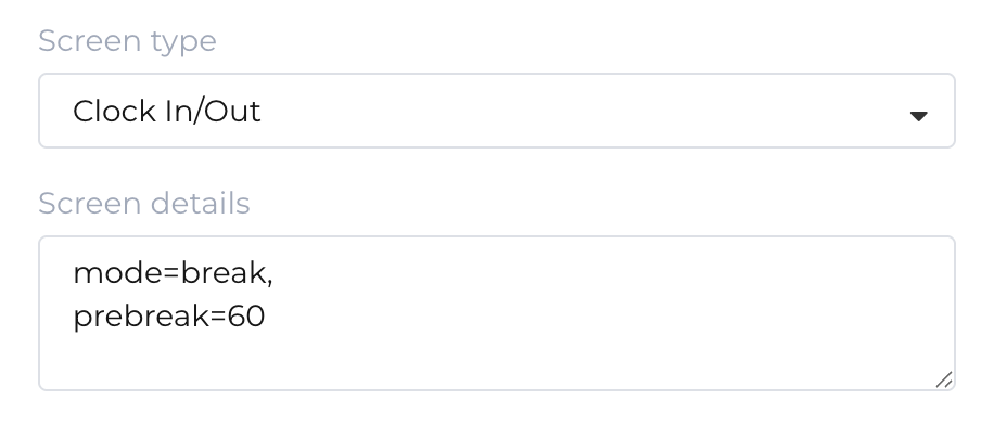 Recording breaks is supported in the Clock In/Out screen, the Task Tracking screen, and the Job Tracking screen. The recording of breaks is enabled by specifying a clocking mode (eg: "mode=break" or "mode=rest") in the Screen Details of your Access Point Type: